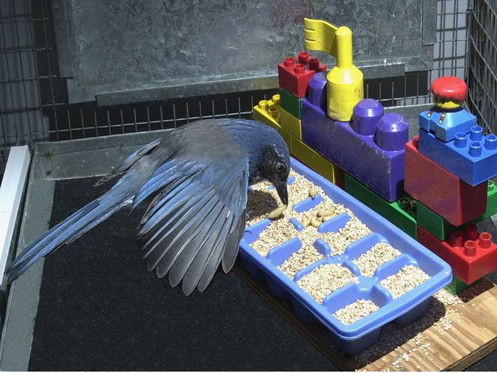Arrendajo escondiendo comida durante el experimento. _________________________________ Hay pájaros que almacenan comida durante las épocas de abundancia para luego recolectarla cuando el alimento escasea durante el invierno. Algunos llegan a esconder más de 30.000 semillas en grupitos de 4 o 5 para recuperarlas más tarde. Parece claro que tienen algún tipo de memoria que les permite recordar los lugares exactos a los que deberán volver más tarde a buscar sus provisiones. ¿O quizá no? Quizá estos pájaros únicamente vuelan a una zona con unas características apropiadas, con un determinado tipo de terreno y matorrales, y allí se valen del olor que desprenden los alimentos para localizar los escondites donde los enterraron. Algo así no sería memoria, sería mero olfato. Aunque nuestra investigación nos invite a suponer que este tipo de aves mantiene un fiel recuerdo de los escondites, probarlo científicamente requiere descartar todas estas y otras explicaciones alternativas, y no resulta fácil hacerlo en el medio natural. Otra explicación alternativa bien podría ser que los pájaros hacen pequeñas marcas en el terreno cuando esconden los alimentos, de manera que después, al ir a buscarlos, no necesiten recordar dónde los habían escondido; únicamente necesitarían buscar esas pequeñas marcas. También podemos suponer que cuando buscan el alimento lo hacen de una manera más o menos al azar, en terrenos que saben que son aptos para ello o en los que previamente han solido encontrar comida, quizá escondida por ellos mismos, quizá por otros pájaros de la misma especie, sin necesidad de recordar absolutamente nada sobre su almacenamiento. En todos estos casos, asumir que el pájaro tiene memoria y recuerda dónde escondió exactamente cada grano de comida sería muy presuntuoso. ¿Tenemos alguna forma de saber si de verdad recuerdan qué escondieron y dónde? La única manera de averiguarlo con certeza es realizando un experimento de laboratorio en el que controlemos bien todas las variables y explicaciones alternativas posibles. Hace falta una gran dosis de ingenio para poder hacerlo. Pero la buena noticia es que se están publicando auténticas joyas en este terreno en los últimos años. Uno de los experimentos más bonitos fue publicado en 1999 por los psicólogos Clayton y Dickinson, de la Universidad de Cambridge. Demostraron que los arrendajos recuerdan perfectamente, no sólo dónde escondieron la comida, sino también qué tipo de comida enterraron en cada escondite, e incluso, cuándo la enterraron (véase también el artículo de Clayton, Bussey y Dickinson, 2003). _________________________________