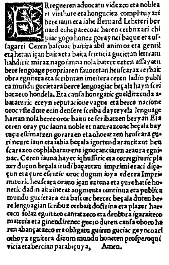 Siendo los vascos diestros, valerosos y gentiles, y habiendo habido, y habiendo todavía, entre ellos grandes letrados en todas las ciencias, estoy atónito, señor, de que ninguno haya intentado componer y escribir en pro de su propia lengua alguna obra en euskara, a fin de que fuera notorio a todo el mundo que es lengua tan apta como las demás para ser escrita. Es ésta la razón por la que se encuentra desprestigiada, sin reputación alguna, y por la que las restantes naciones creen que nada puede escribirse en dicha lengua como las demás escriben en la propia.