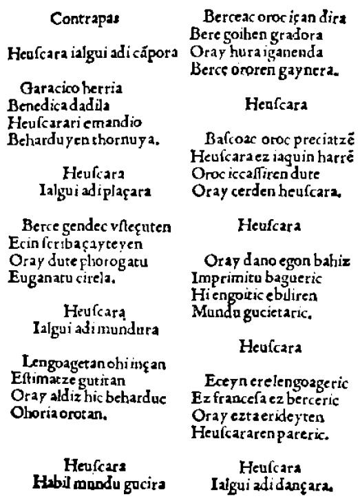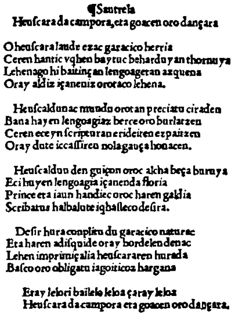 Ya que el euskara ha salido, vayamos todos a bailar. Oh, euskara, ensalza el país de Garazi, pues has recibido de allí el rango que mereces. Si antes fuiste la última entre las lenguas, ahora en cambio vas a ser la primera de todas. Los vascos eran apreciados en todas partes, pero todos los demás se mofaban de su lengua, porque no se hallaba impresa en escrito alguno. Ahora van a comprender qué hermosa era. Todo vasco levante la cabeza, pues su lengua va a ser la flor y nata. Príncipes y grandes señores preguntan por ella, deseosos de estudiarla en texto escrito, si pudiesen. Tal deseo lo ha colmado un hijo de Garazi y un amigo suyo, residente ahora en Burdeos. Él es el primer impresor de la lengua vasca. Desde ahora todos los vascos tienen una deuda con él. Y tirorirorí, tirorirorá. ¡Más tararí, más tarará! Vamos todos a bailar, que el euskara sale a la calle. |