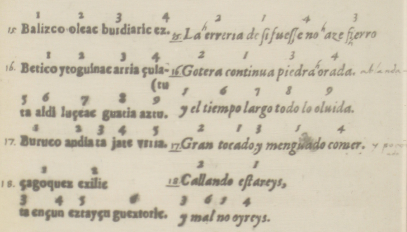 Refranes y Sentencias comunes en Bascuence, declaradas en romance con números sobre cada palabra, para que se entiendan las dos lenguas, Pamplona 1596 Refranes de Esteban de Garibay (1533-1599): dos colecciones perdidas; copia manuscrita del s. XVII; edición del s. XIX Cantares de Garibay (intercalados en sus obras de historia) Doctrina Christiana en Romance y Basquenze, por el doctor Betolaza, Bilbao, 1596 |