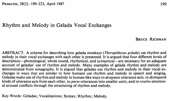 Some vocal distinctive features used by gelada monkeys”, JASA, 60, 1976. “The synchronisation of voices by gelada monkeys”, Primates, 19, 1978. “Rhythm and Melody in Gelada Vocal Exchanges”, Primates, 28, 1987. |
