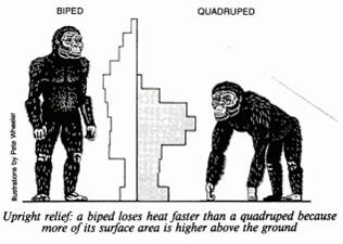 Segunda etapa de la bipedaciónRelacionada con la expansión de la sabana producida por un cambio climático de hace algo menos de 2 millones de años. La bipedación responde a la necesidad de reducir el calor causado por la mayor exposición al sol en .paisajes con pocos árboles. Wheeler (Stand tall and stay cool, 1988) demostró que la locomoción bípeda reduce el cansancio (derivado del calor) y el consumo de agua. H. ergaster podía recorrer mayores distancias en la sabana para buscar carroña, probablemente a las horas en las que la competencia descansaba. Así, pudo aumentar el consumo de carne en su dieta. |